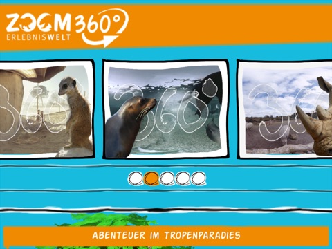Die 360° App steht für einen spielerischen Umgang mit den Erlebniswelten. Unter dem Stichwort Edutainment vermittelt die App zielgruppenspezifisch Wissen über die Pflanzen- und Tierwelten von Alaska, Afrika und Asien. Die Inhalte sind mit der App bequem über das eigene Smartphone verfügbar; an vielen Standpunkten können Sie so ihr Wissen erweitern.