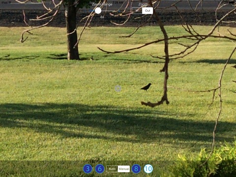 The bottom of the screen has four buttons which set the number of photos the app will capture. The buttons are labeled "3" "6" "8" and "10". In "Auto" mode, once you press one of the numbered buttons, the app begins to capture and incrementally zoom until the corresponding number of photos have been captured.