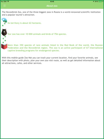 Zoo Nsk is a free mobile application for Rostislav Shilo Novosibirsk zoo, one of the three biggest zoos in Russia. Zoo Nsk is provided to navigate on the zoo territory and to inform visitors about the zoo animals, attractions, working hours, and services. The Zoo Nsk app is a great chance to make your visit to Rostislav Shilo Novosibirsk zoo more interactive and usable. The zoo has over eleven thousand animals from all over the world and is an active participant of different captive breeding programs for endangered species.