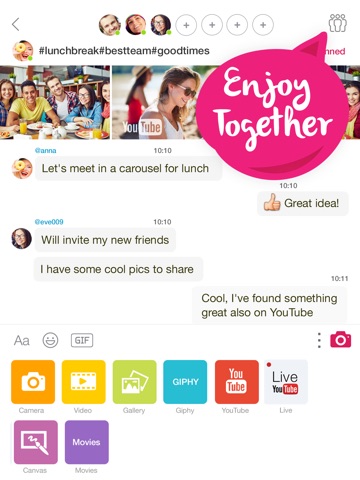 Share, chat and interact with collections of photos, videos and other media with new and existing friends from all over the world. Add everything to a carousel identified by a hashtag. Discover new carousels created by other users. Everyone sees changes as they happen and all can chat, add media and interact at the same time.
