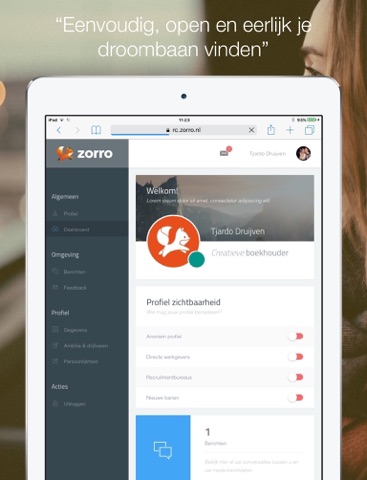 Zo werkt het... "Een profiel op Zorro vertelt hem meer van alleen je arbeidsverleden en je opleidingen; het vertelt wie je bent, waar je enthousiast van wordt en wat jou drijft. Bij Zorro gaat het dus ook om waar je heen wilt en welke ambities of dromen je hebt. Zo zorgt Zorro ervoor dat werkgevers en werknemers elkaar op een eerlijke, efficiënte en betrouwbare wijze vinden, met het oog op duurzame inzetbaarheid."