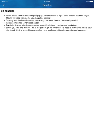 Our referral tool kit is strategically designed to be an effective closing gift that will help in capturing referrals. Front and center is a business-card holder for 10 business cards. This is priceless branding, with the name of your business and your business card in front of your clients each and every time this toolkit is used. They are now ready to share your information.