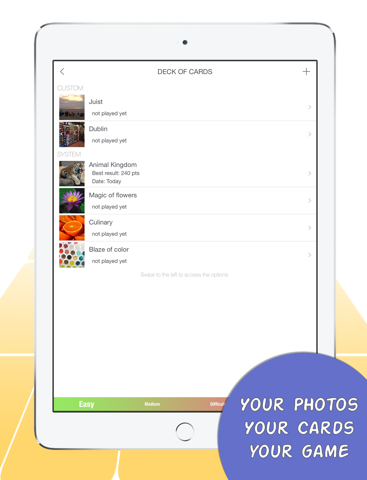 Keep your memories alive, train your memory and have enthralling moments with your friends. This is what Zwoople offers in the style of the popular game of pairs for iPhone and iPad with YOUR photos. Unlike other games we do not only provide predefined sets of cards but enable you to create an unlimited amount of custom sets. Furthermore you can share these sets with your friends and family.